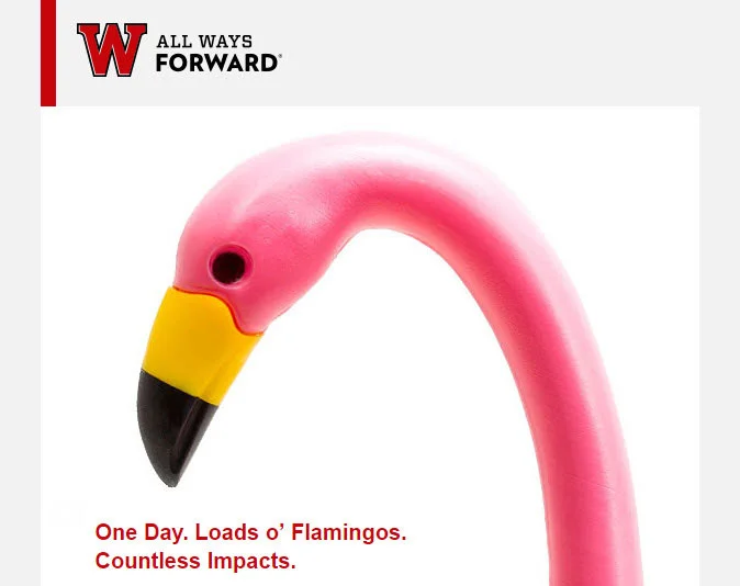 This message was part of a series of emails asking alumni to donate during a campaign called Fill the Hill. For each donation on that day, a flamingo was placed on Bascom Hill.